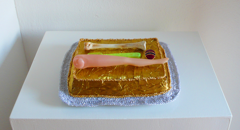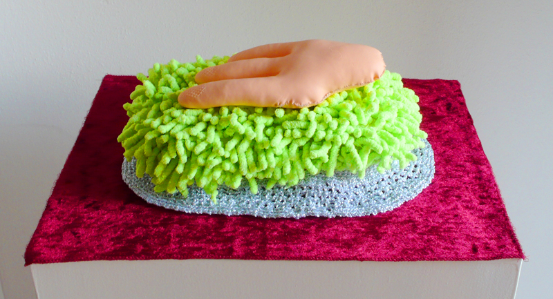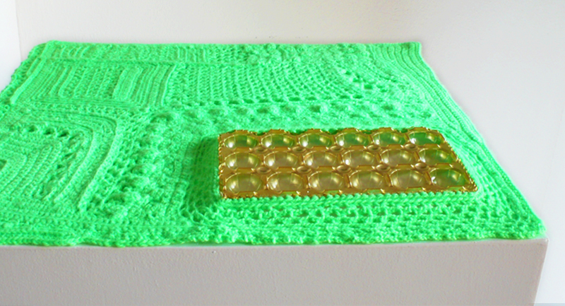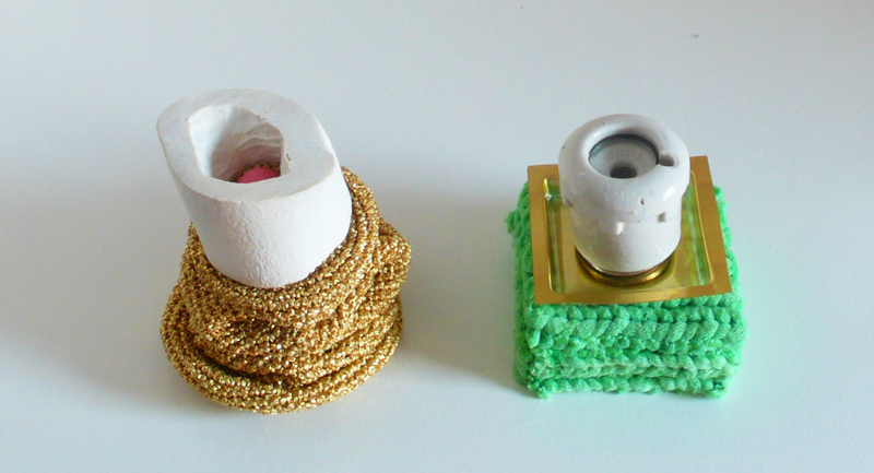 Aus diesem schier unendlich grossen Fundus wählt Steiner gezielt ihre Werkstoffe aus. Sie löst diese Gegenstände aus ihrem gewohnten Kontext, umhäkelt sie zum Beispiel mit goldenem Garn und stellt die so neu entstandenen Objekte auf weisse Sockel.