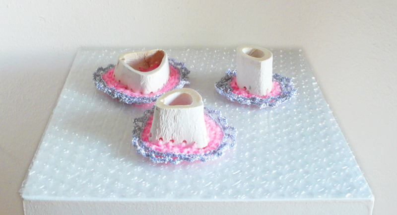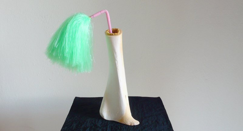 Andrea Steiners Objekte entstehen allesamt aus alltäglichen Gebrauchge-genständen. Durch das Verwenden von scheinbar wertlosen Dingen wie alte Lockenwickler, abgenagten Pouletknöchlein oder leeren Verpackungsmaterialien, wird alltägliches und banales Material verwandelt und erhält so eine neue Aufmerksamkeit und Bedeutung.
